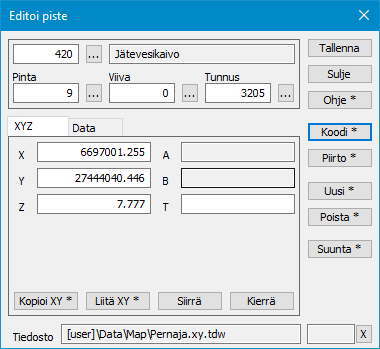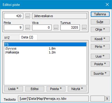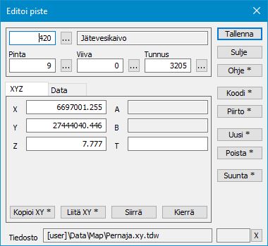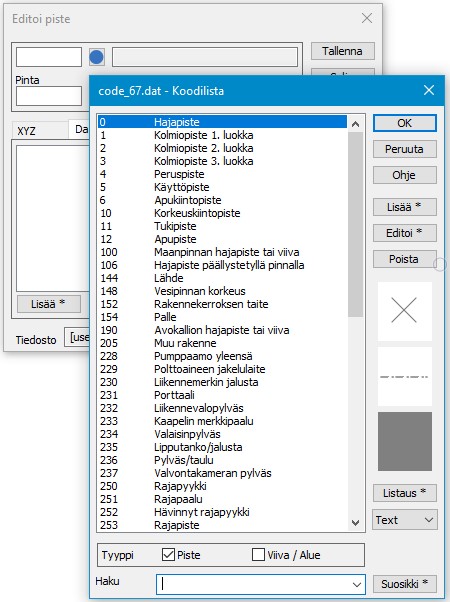 Jokaisella pisteellä on useita koodikenttiä, joilla määritetään mm. pisteen tyyppi ja koordinaatit. Lisäksi pisteillä voi olla käytössä pisteen lajikoodiin sidottua tai muuta ominaisuustietoa. Dialogi avataan toiminnolla Editointi – Pisteet – Editoi.