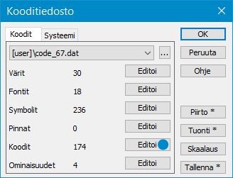 Kooditiedostossa Asetukset – Koodit määrätään käyttäjän haluamat värit, tekstifontit, symboliikka pisteille, viivoille ja alueille sekä halutessa jollekin kohteelle ominaisuustietoa, niiden määritykset. Kooditiedostoja on käytettävissä useita, mutta vain yksi voi olla käytössä kerrallaan. Käyttäjän on helppo vaihtaa kooditiedostoa aineiston ja tarpeen mukaan.