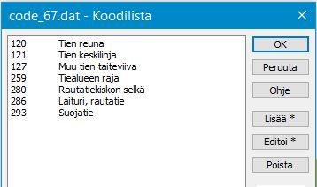 Koodikenttien leveys on vapaa. Kun klikkaat dialogissa kenttien T1 tai T3 viereistä selauspainiketta saat auki kaikki sille kentälle käytettävissä olevat koodit tai pinnat, jotka kooditiedostossasi on määritetty.