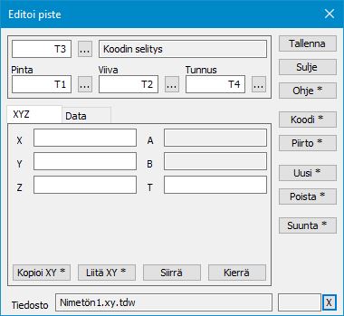 Dialogeissa näytetään kentät T1-T4 sekä T3-koodin selitysteksti kooditiedostosta. Arvojen haku kooditiedoston listoista tapahtuu kunkin kentän vieressä olevalla selauspainikkeella. Ominaisuudet näytetään erillisellä Data-välilehdellä.