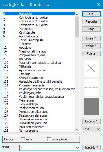 Tyyppi-kohdassa voi suodattaa listaan näkymään vain pistemäiset tai viivamaiset kohteet.alitun koodin poistaminen.