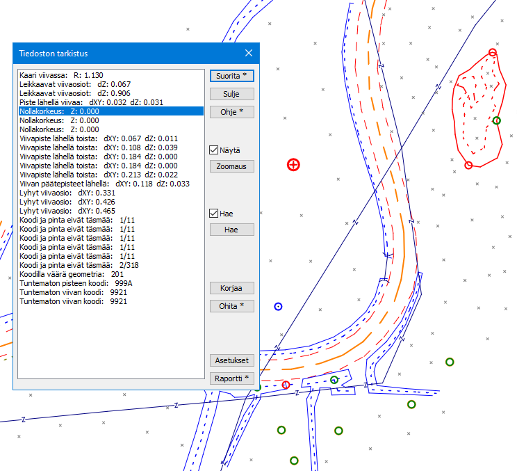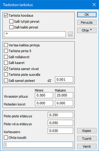 Tarkistaa koodit ja pintatunnukset, joita ei löydy kooditiedostosta. Tarkistaa myös pisteiden ja viivamaisten kohteiden oikean koodauksen sekä koodien täsmäävyyden pintatunnuksiin. Jos erillistä ohjaintiedostoa ei anneta, vastaavat tiedot haetaan käytetyn ( * ) kooditiedoston koodi määrittelyistä.