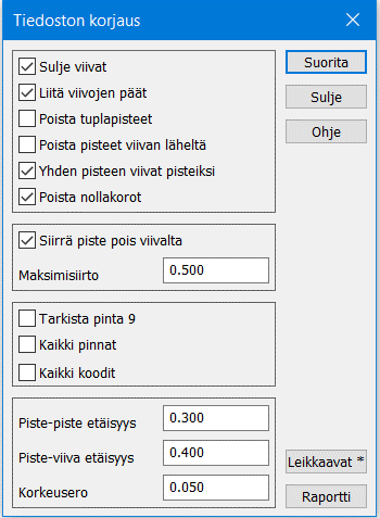 Siirtää viivojen päät samaan koordinaattiin, jos niiden vaakaetäisyys on vähemmän kuin piste-piste etäisyys ja korkeusero vähemmän kuin Korkeusero-asetus. Jos Kaikki koodit -asetus on päällä, ei viivojen koodeja tarkisteta. Muutoin liitetään vain viivat, joilla on sama koodi.