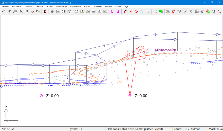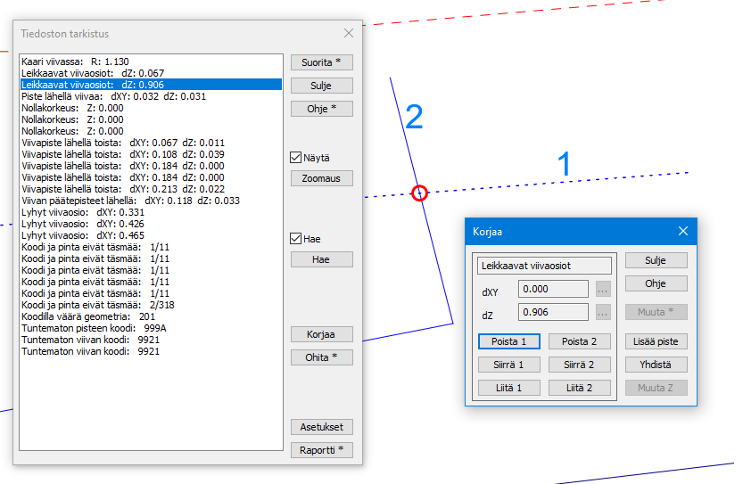 Nollakorkeudet (tai muuten väärät korkeudet) tulee joko poistaa, kor jata niiden korkeuslukema tai vaihtaa kyseisten pisteiden pintatunnus 9-pinnaksi ennen kolmiointia.
