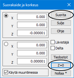 Valitse hakutavaksi valikosta Suorakaide ja korkeus ja paina Z=0. Kun painat Suorita, ohjelma löytää ryhmään kolme pistettä, joilla on korkeutena 0.