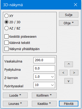 Valitaan 2D/3D ja asettaa vaakakulmaksi esimerkiksi 200 ja pystykulmaksi 0. Painat Päivitä, huomaat samat kolme pistettä, jotka poikkeavat muista korkeuksista. Tätä voidaan korostaa valitsemalla toi minnolla Asetukset – Pisteen esitys päälle Z-arvot. Pelkät nolla korot saat näkyviin ruksaamalla Valitut.
