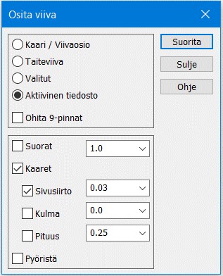 Työkalutoimintoja viivojen käsittelyyn. Toiminnot käsittelevät vain aktiivisen tiedoston viivat tai sen valitut viivat. Viiva on valittu, jos sen yksikin piste on valittu ryhmään.