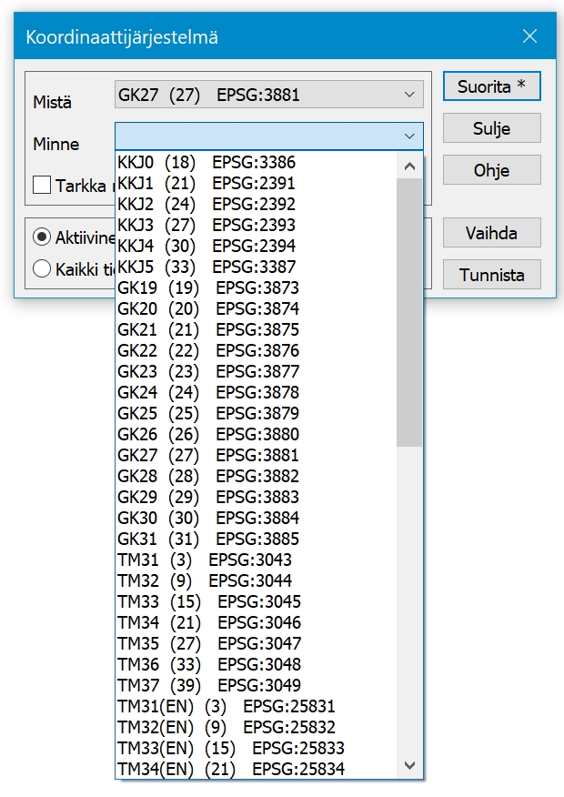 Lisätty EPSG-koodit useimpiin koordinaattijärjestelmien valintalistoihin.