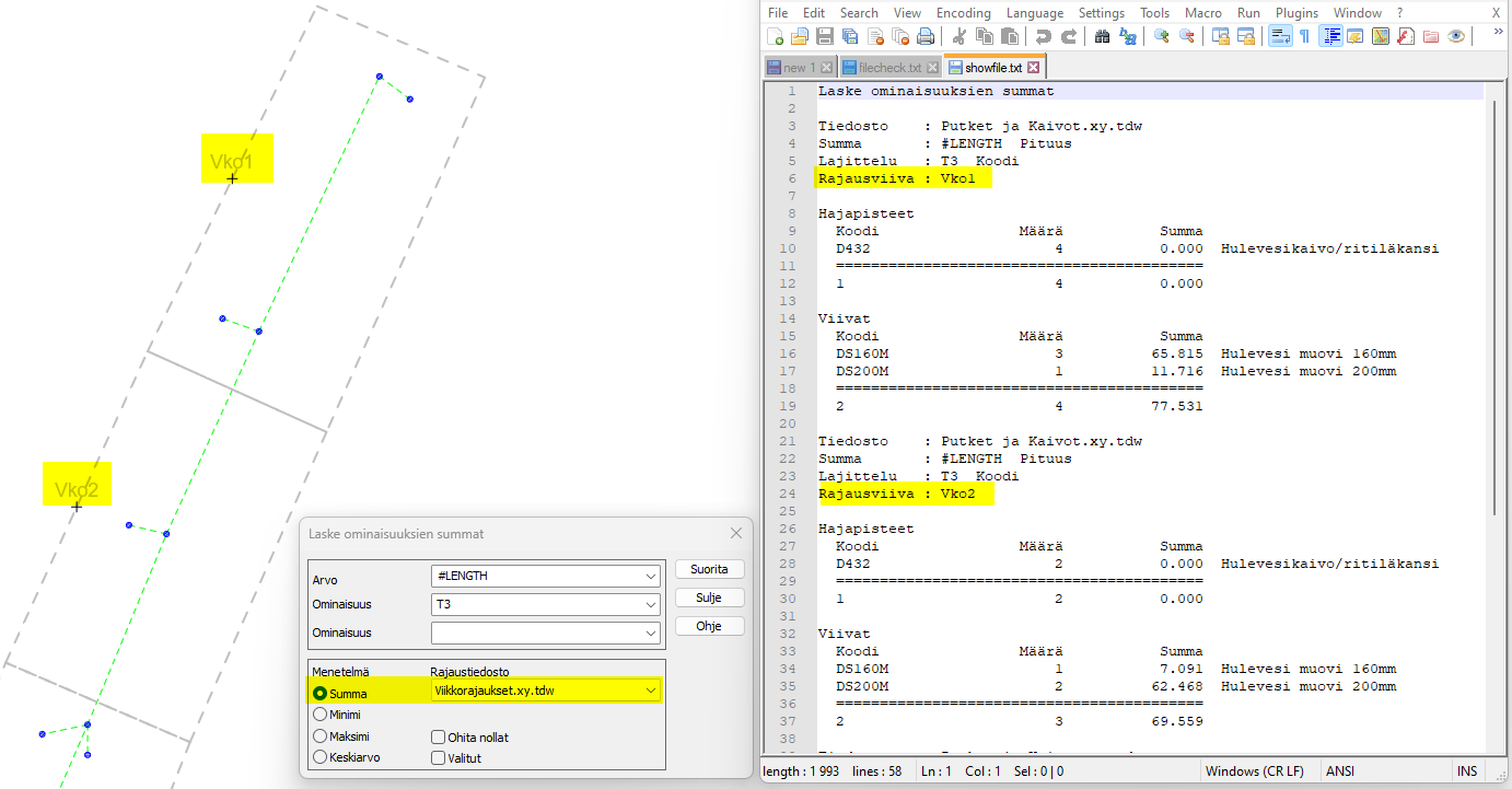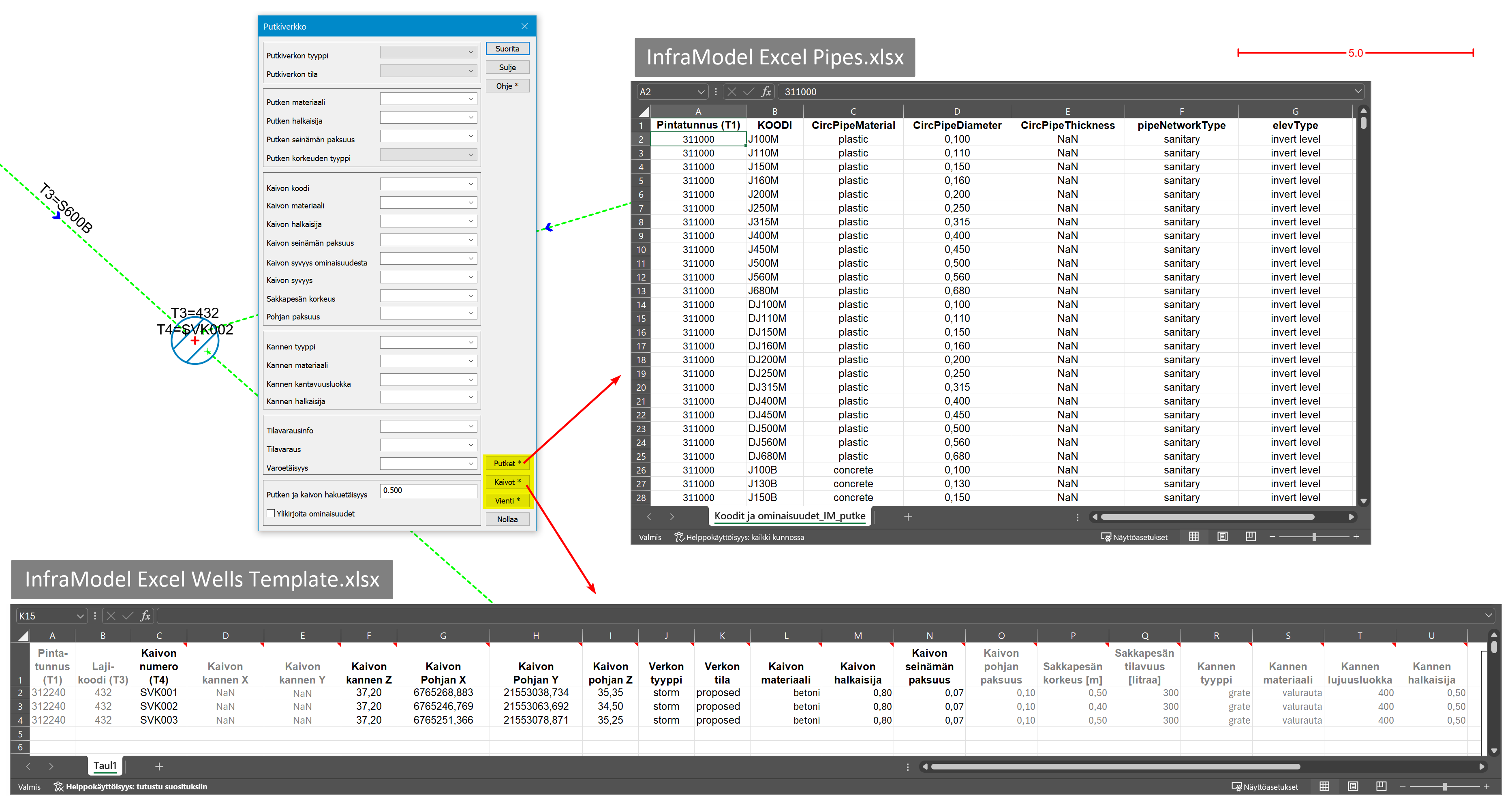 Kun ominaisuudet on haettu sekä kaivoille että putkille, voidaan suorittaa Putkiverkko-toiminto, joka linkittää objektit Inframodel-standardin mukaisesti.