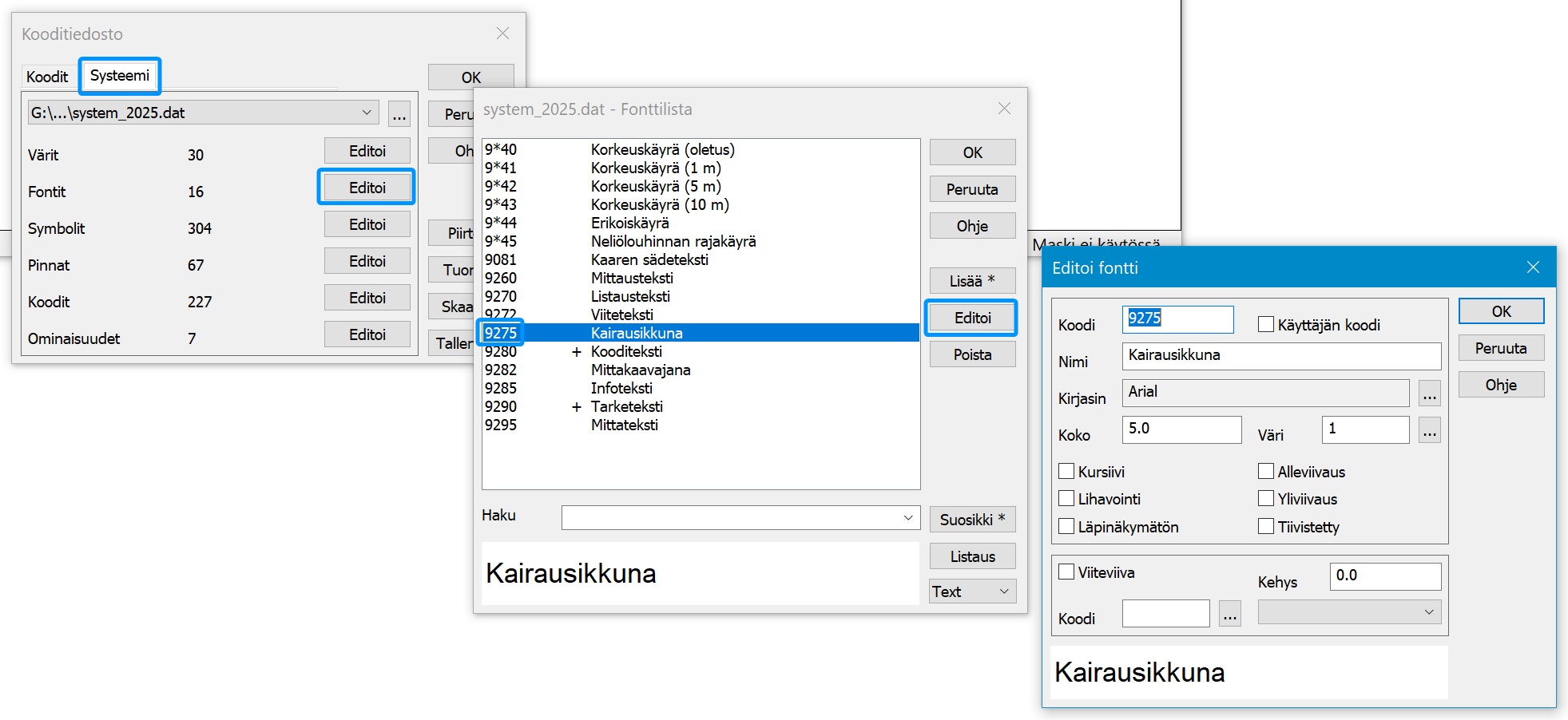 Kairadiagrammin tekstien fonttia voidaan muuttaa systeemifonttikoodilla 9275.