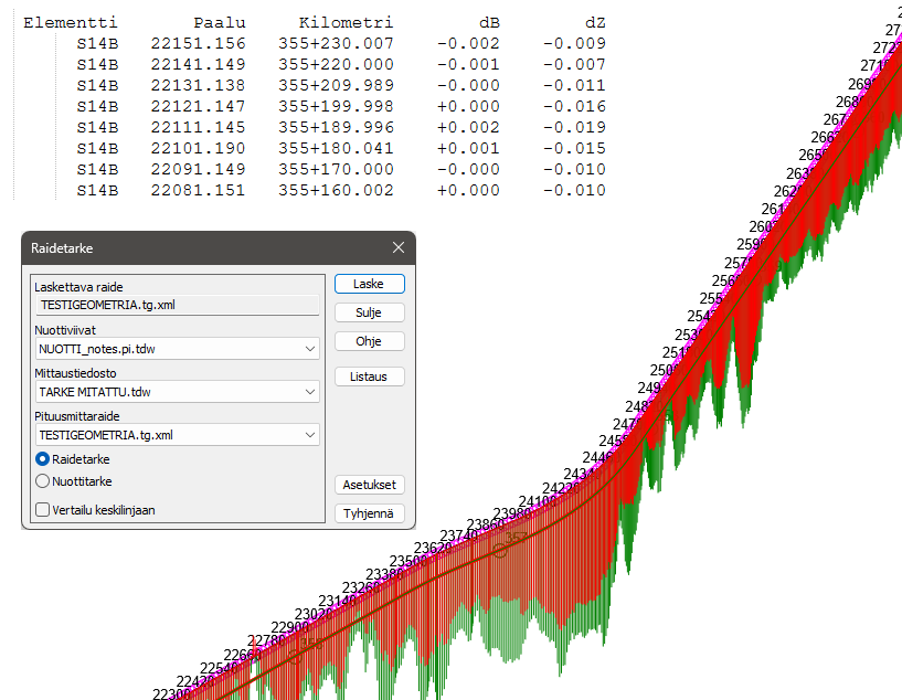 Tarketoiminnolla voidaan nyt laskea mitatun raiteen eromitat geometriaan nähden ja esittää tuloslistauksena tai tarkemittausasetusten avulla erovektoreina. Näin voidaan tarkastella raiteen sijaintia suhteessa geometriaan ennen tukemista ja tukemisen jälkeen.