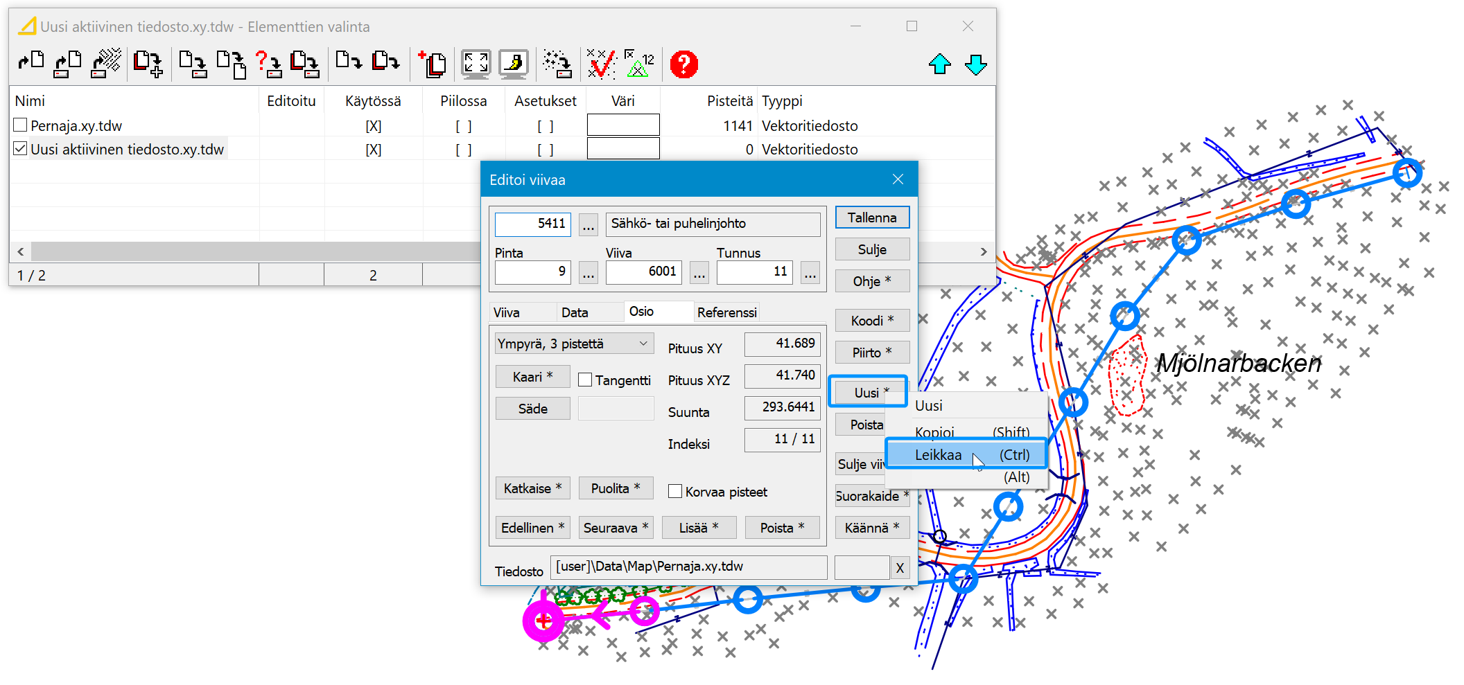 Pernaja.xy.tdw -tiedostosta leikataan sähkölinja aktiiviseen tiedostoon.