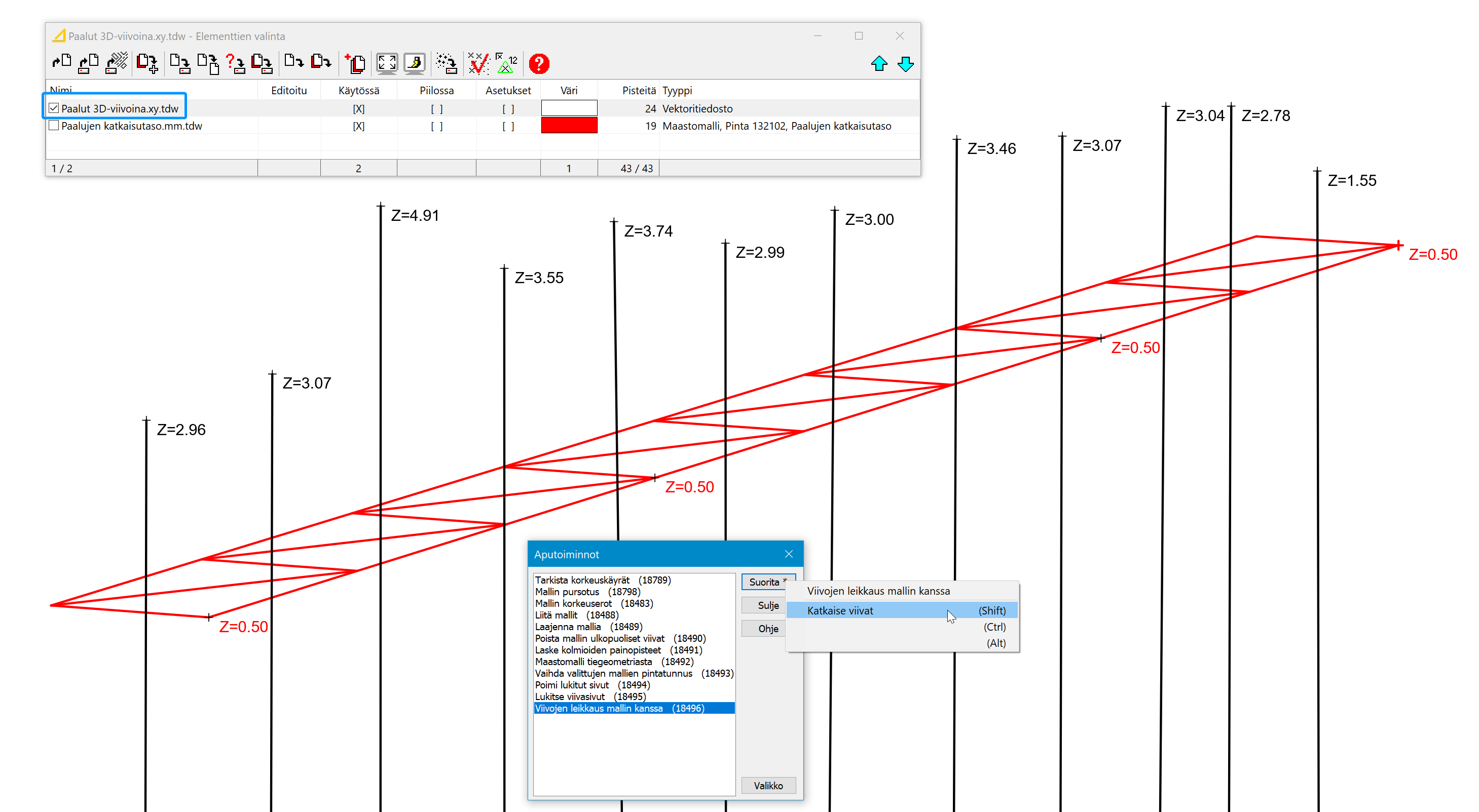 Elementtilistan mallin Z-korkeus on 0.5m, aktiivisen vektoritiedoston viivat katkaistaan mallin ja viivan leikkauspisteestä. Pelkkä Suorita-toiminto lisää vain leikkauspisteen viivalle. Mikäli malleja on useampia elementtilistassa, käytetään elementtilistan alimpana olevaa mallia.