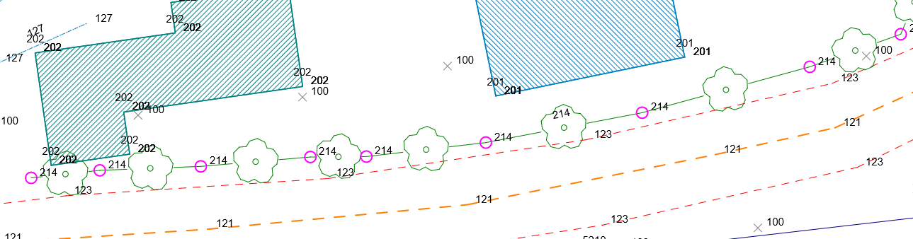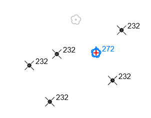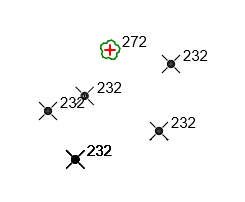 Lisää tähän uuteen tiedostoon pisteitä edellä kuvatulla toiminnolla Editointi – Lisää kohteita. Valitse Piste- välilehti, lisää T3-kenttään koodi 232 (Liikennevalopylväs), valitse hakutavaksi Hiiri ja paina ruudulla parista kohtaa, jolloin ruudulle ilmestyy pisteitä.