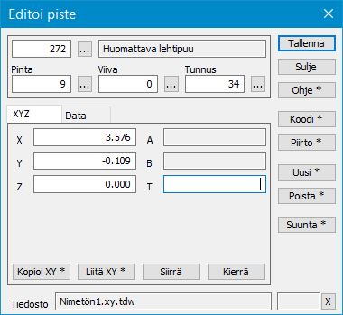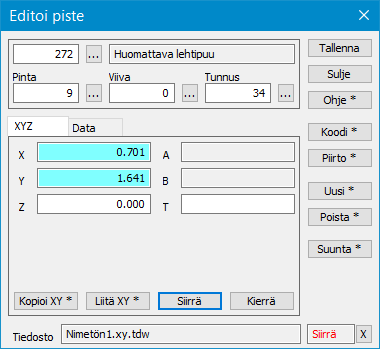 Näytä jotain ruudun hajapistettä hiirellä, jolloin pisteen tiedot ilmestyvät dialogiin. Anna T3-kenttään arvo 272 (Huomattava lehtipuu) ja paina Tallenna, jolloin pisteen symboli vaihtuu. Pisteen paikkaa voi myös siirtää antamalla sille käsin uudet koordinaatit tai osoittamalla hiirellä uusi paikka Siirrä -toiminnolla.