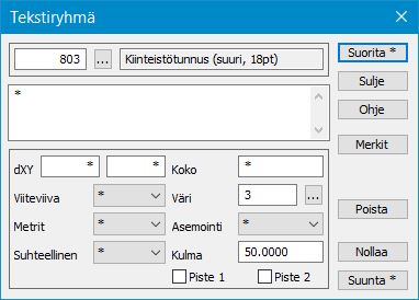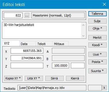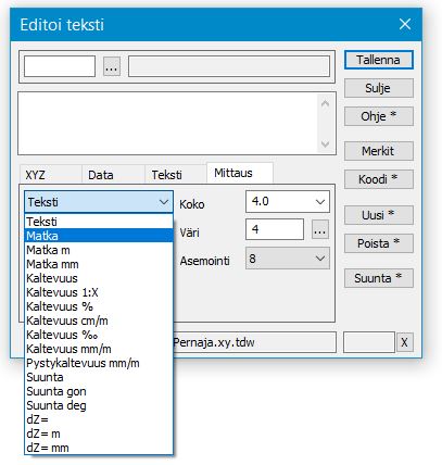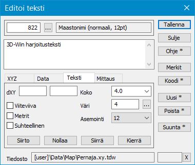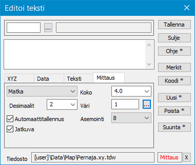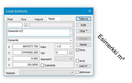 Teksti-välilehdellä voit antaa haluamasi Tekstin, Koon, Värin ja T-kohdassa suunnan, johon teksti kirjoitetaan (100=vaakataso). Tekstin suunnan voi myös osoittaa antamalla sille toisen pisteen (2 pistettä -rasti)