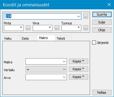 Valitse hakutavaksi Koodit ja ominaisuudet (Ctrl+F). Anna T3-kentän arvoksi 214 (Lehtipuurivi). Suorita ja pisteryhmässä on 14 pistettä, koodilla 214.