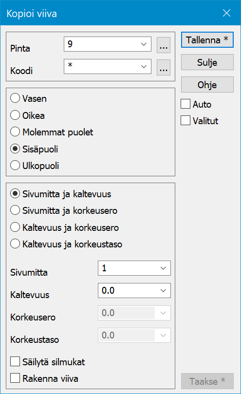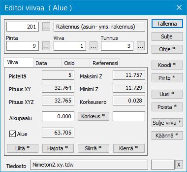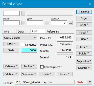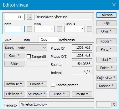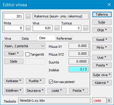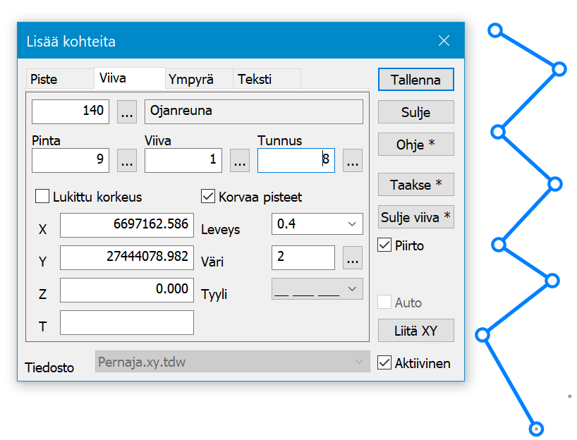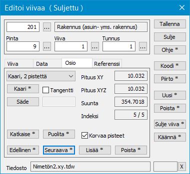 Viiva-välilehdellä tehdään viivan lisäys kuten edellä. Huomaa, että ennen tallennusta olevia viivan pisteitä ei voi poistaa Kumoa-toiminnolla, vaan ne tule poistaa Taakse-painikkeella. Shift+Taakse poistaa koko osoitetun viivan.
