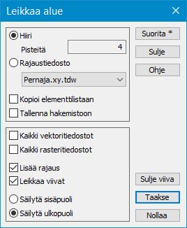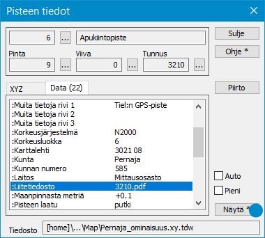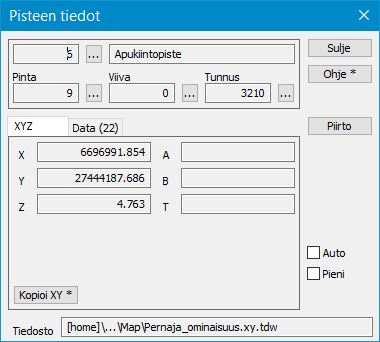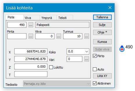 Piste-välilehdellä voit osoittaa pisteen hakutavalla Hiiri, Hiiri XY tai Lähin piste tai antaa koordinaatit käsin. Anna tunnukset ja paina Tallenna, jolloin piste tallentuu oletuksena Aktiiviseen elementtiin. Jos poistat Aktiivinen-rastin, voit valita tai vaihtaa listasta minkä tahansa elementtilistassa olevan tiedoston, johon uudet pisteet tallennetaan. Auto-rastin ollessa päällä ei Tallenna-painiketta tarvitse painaa, vaan uudet pisteet tallentuvat automaattisesti jokaisen hiiren painalluksen jälkeen.