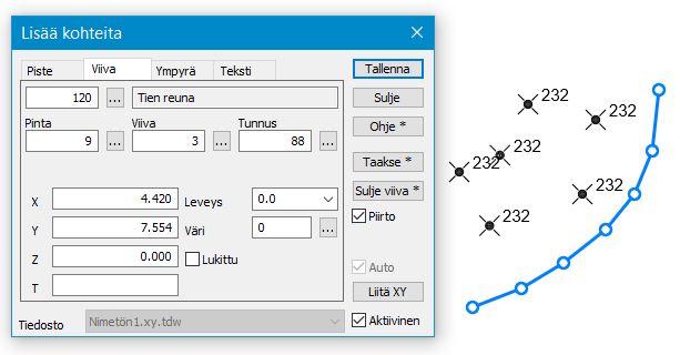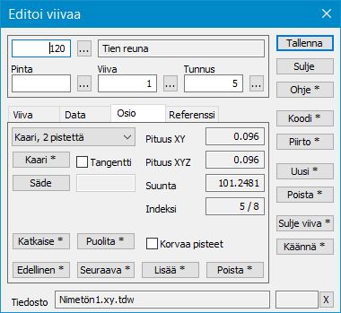 Tee lisäksi vähintään viiden pisteen taiteviiva Viiva-välilehdellä ja anna T3-kentän koodiksi 120 (Tien reuna).