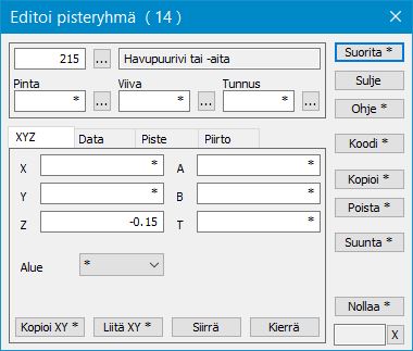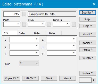 Avaa nyt toiminto Editointi – Pisteet – Ryhmä ja aseta T3-kentän arvoksi 215 (Havupuurivi). Kun painat Suorita, ryhmässä olevien pisteiden koodiksi vaihdetaan 215.