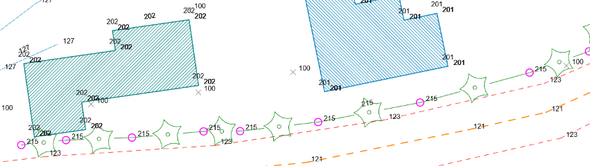 Kun viiva on kokonaan osoitettu, paina Tallenna-painiketta. Viivan voi sulkea alkupisteeseen painamalla Sulje viiva -painiketta. Sulje viiva myös tallentaa viivan automaattisesti. Viivan koodin mukainen symboliikka ilmestyy ruutuun vasta tallennettuasi viivan. Viivan lisäyksessä ei voi käyttää Auto-toimintoa tallentamiseen.