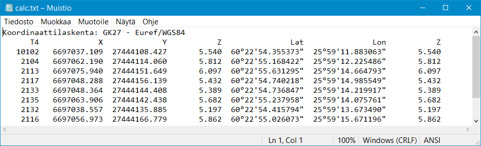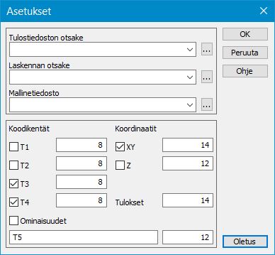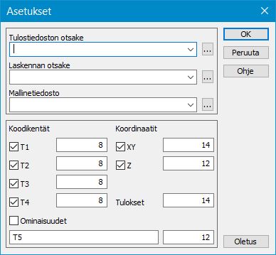 Viereisessä kuvassa on esitetty eräät tyypilliset asetukset, jolloin T3- ja T4-kenttä tulostuvat 8 merkkiä leveänä sarakkeena ja XYZ-koordinaatit tulostuvat 14 merkin sarakkeina.