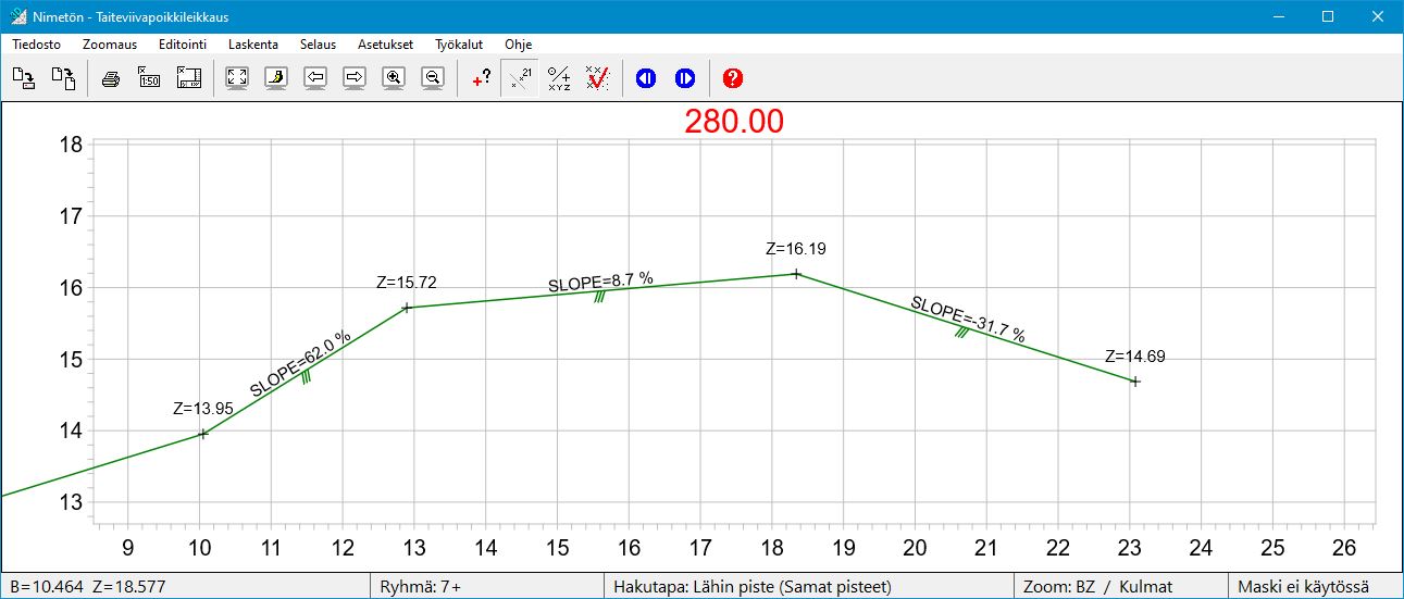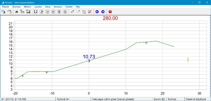 Ikkunassa näkyy poikkileikkauksen paaluluku 280.00 ja tiegeometrian (tasausviivan) korkeus 10.73.
