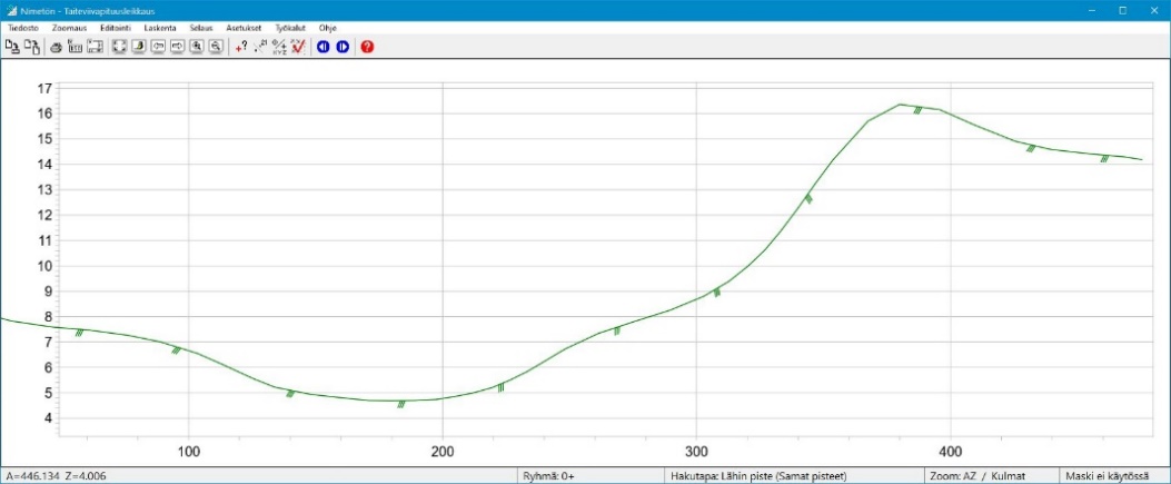 Pidä Shift- ja Ctrl -painikkeet pohjassa. Liikuta hiirtä (1. painike pohjassa) pääikkunassa tiegeometrian suuntaisesti. Huomaat, että voit portaattomasti tarkastella taiteviivapoikkileikkausta ja toiminto on kiinnittynyt aktiivisena olevaan tiegeometrialinjaan.