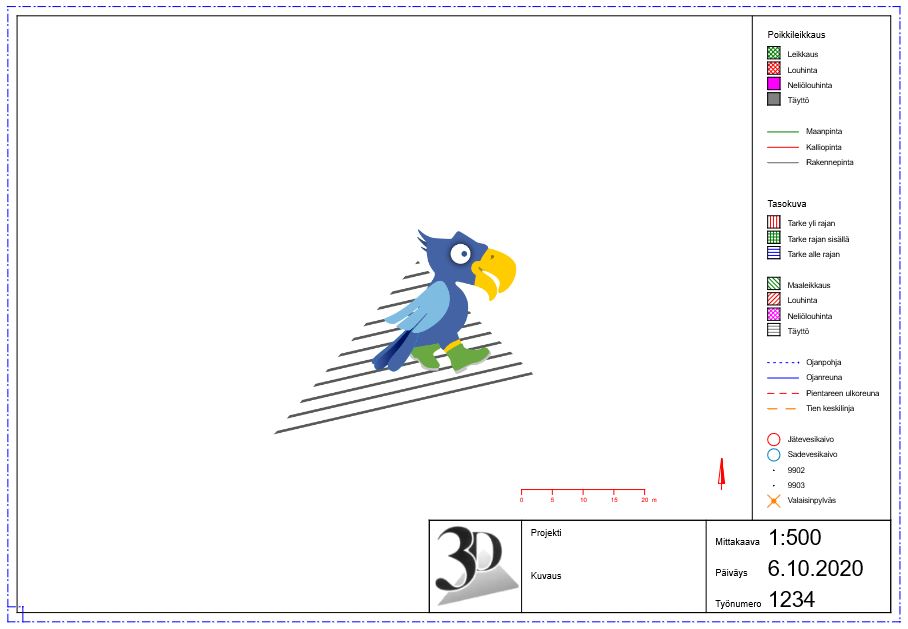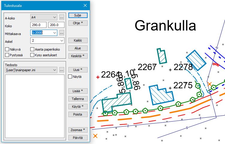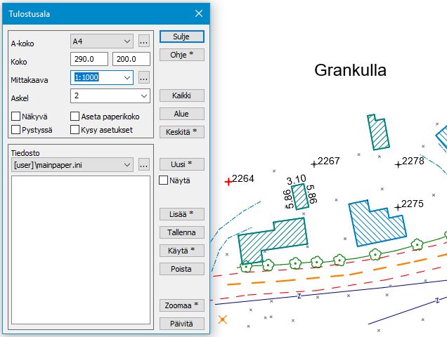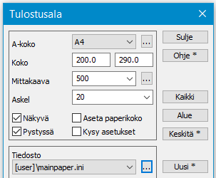 Voit muuttaa Mittakaava-kohdassa suhdeluvun valitsemalla sen joko listasta tai kirjoittamalla suoraan esimerkiksi 500 (= 1:500).