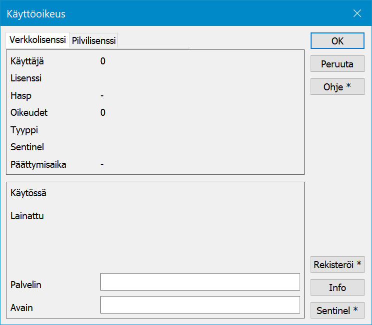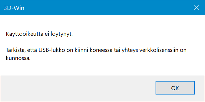 Mikäli oheinen dialogi avautuu, ei ohjelma ole löytänyt lisenssiä USB-portista tai verkkopalvelimelta, tai palvelinta, josta lisenssiä haetaan, ei ole määritetty.