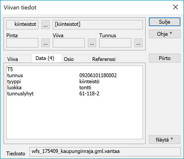 Kohdetyyppi siirtyy suoraan kohteen koodiksi ja ominaisuudet kohteen ominaisuuksiksi. Esimerkiksi edellisellä määrittelyllä luetulla tontilla on seuraavat tiedot: