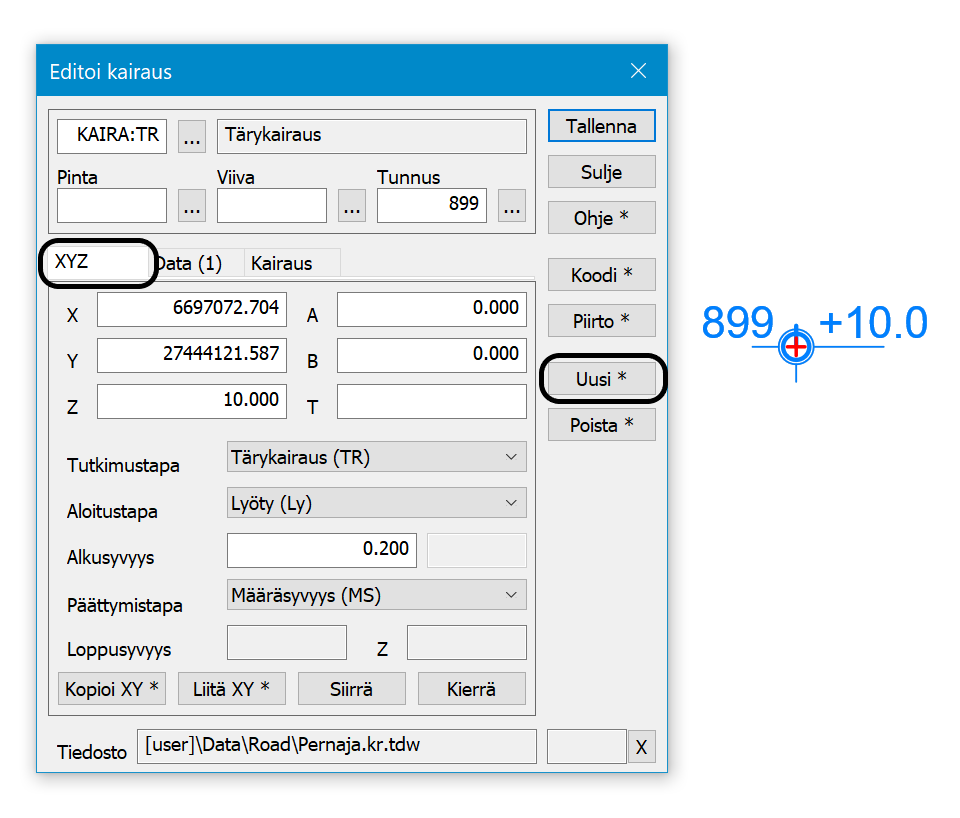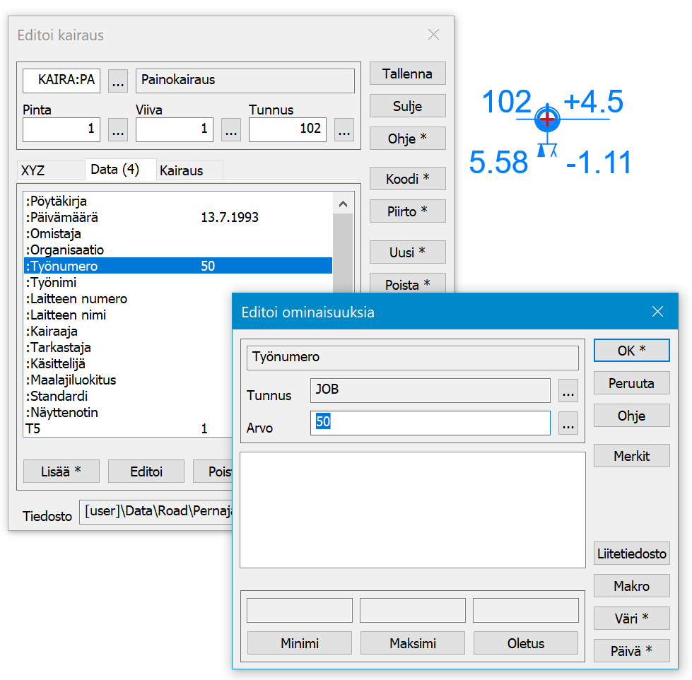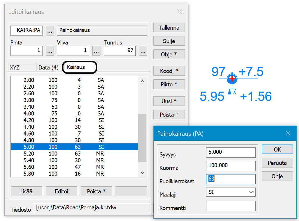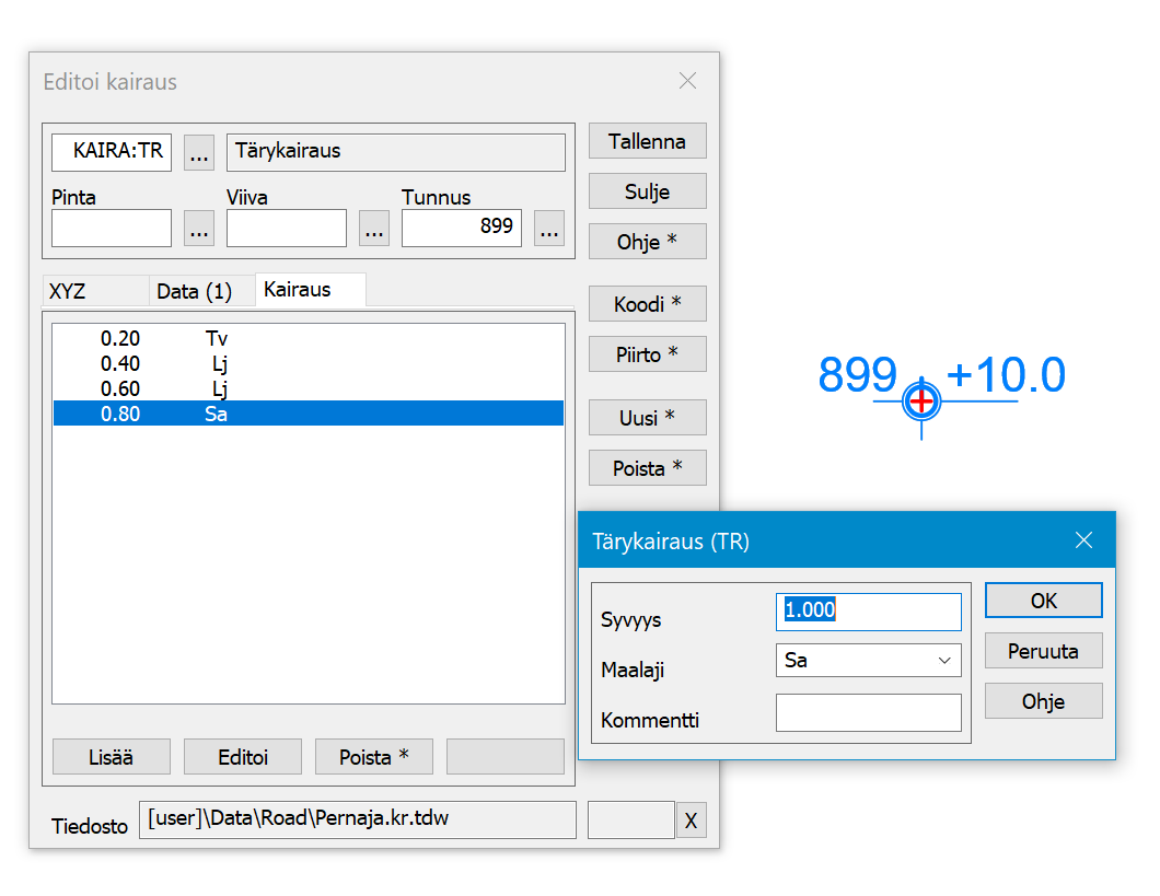 Muutokset päivittyvät automaattisesti näkyvissä olevaan kairausikkunaan ja dialogiin. Jos haluat tallentaa muutokset pisteelle, paina Tallenna-näppäintä!