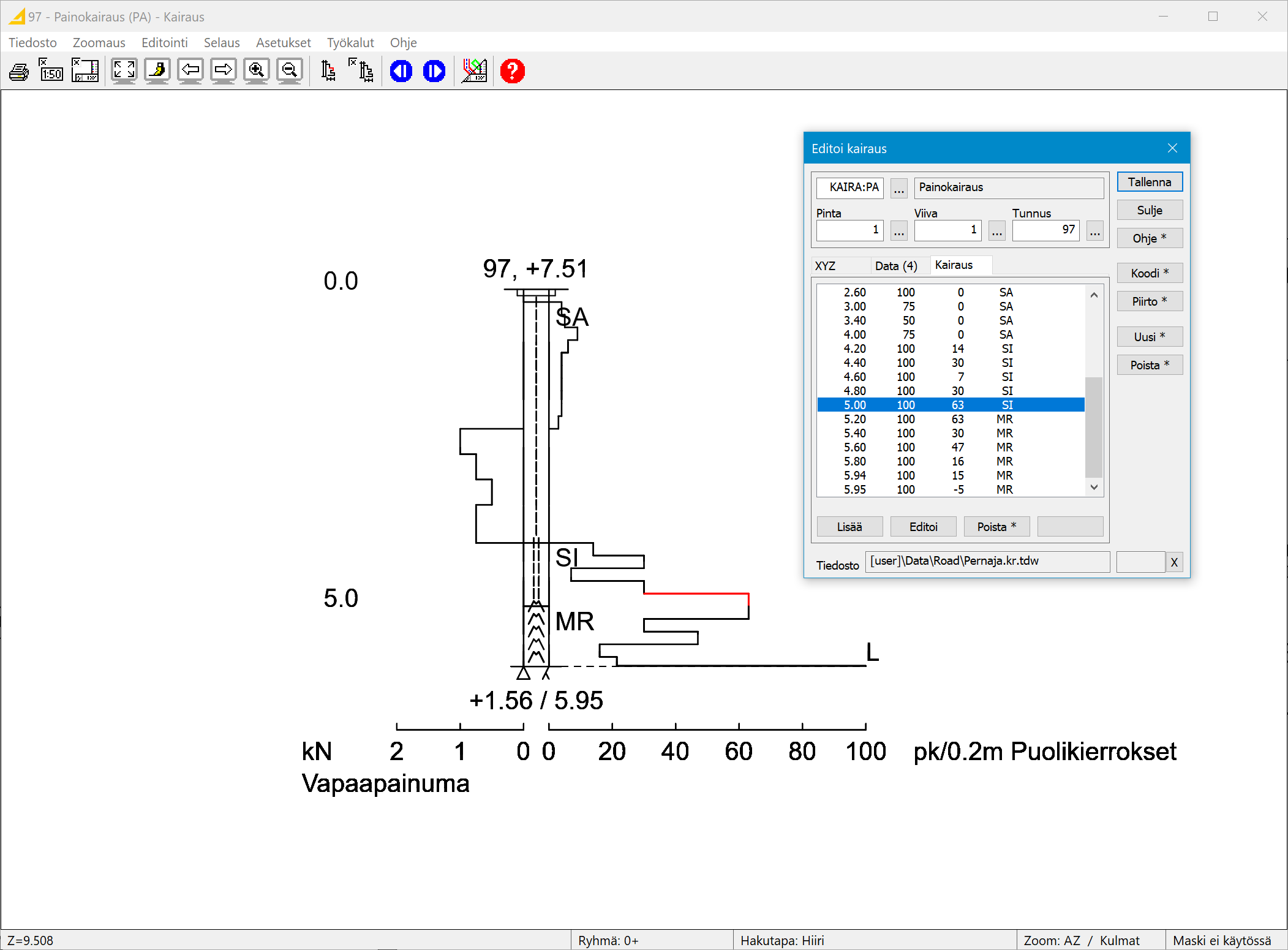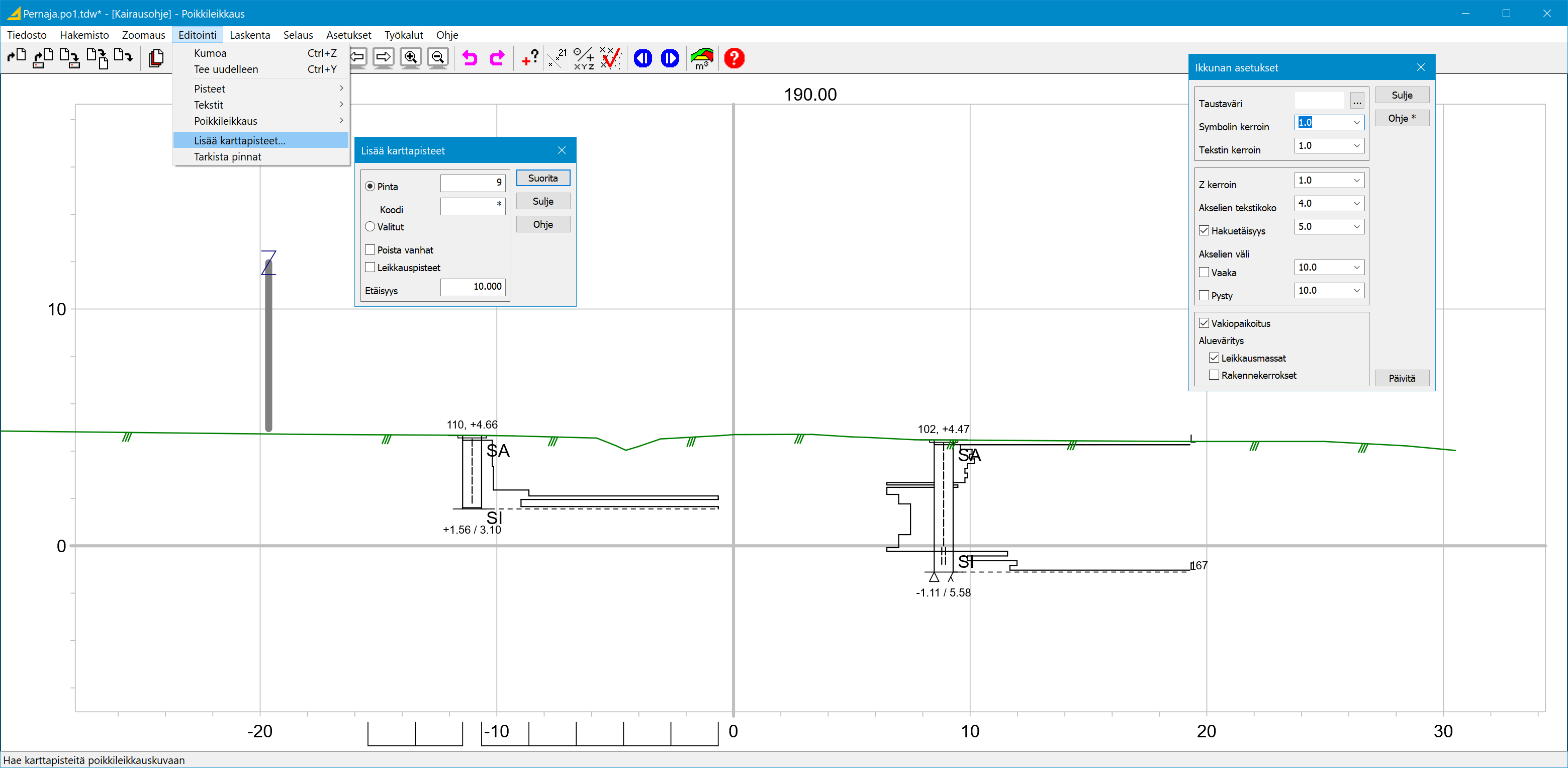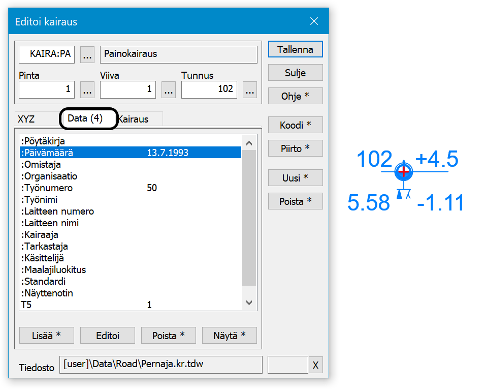 Muutokset päivittyvät automaattisesti näkyvissä olevaan kairausikkunaan ja dialogiin. Jos haluat tallentaa muutokset pisteelle, paina Tallenna-näppäintä!
