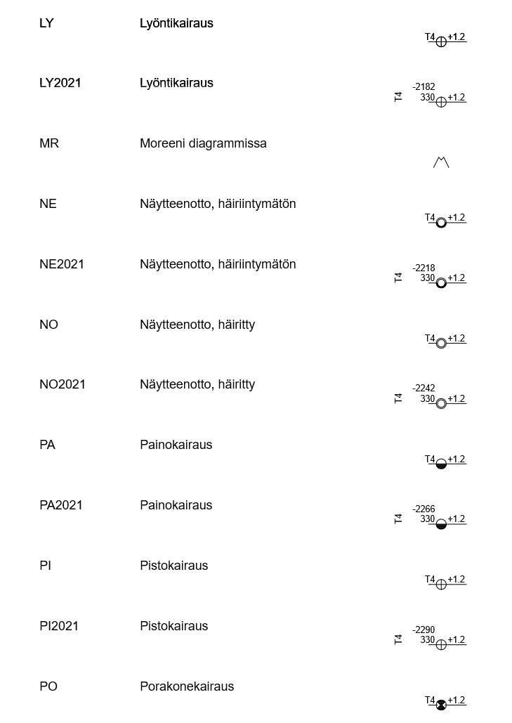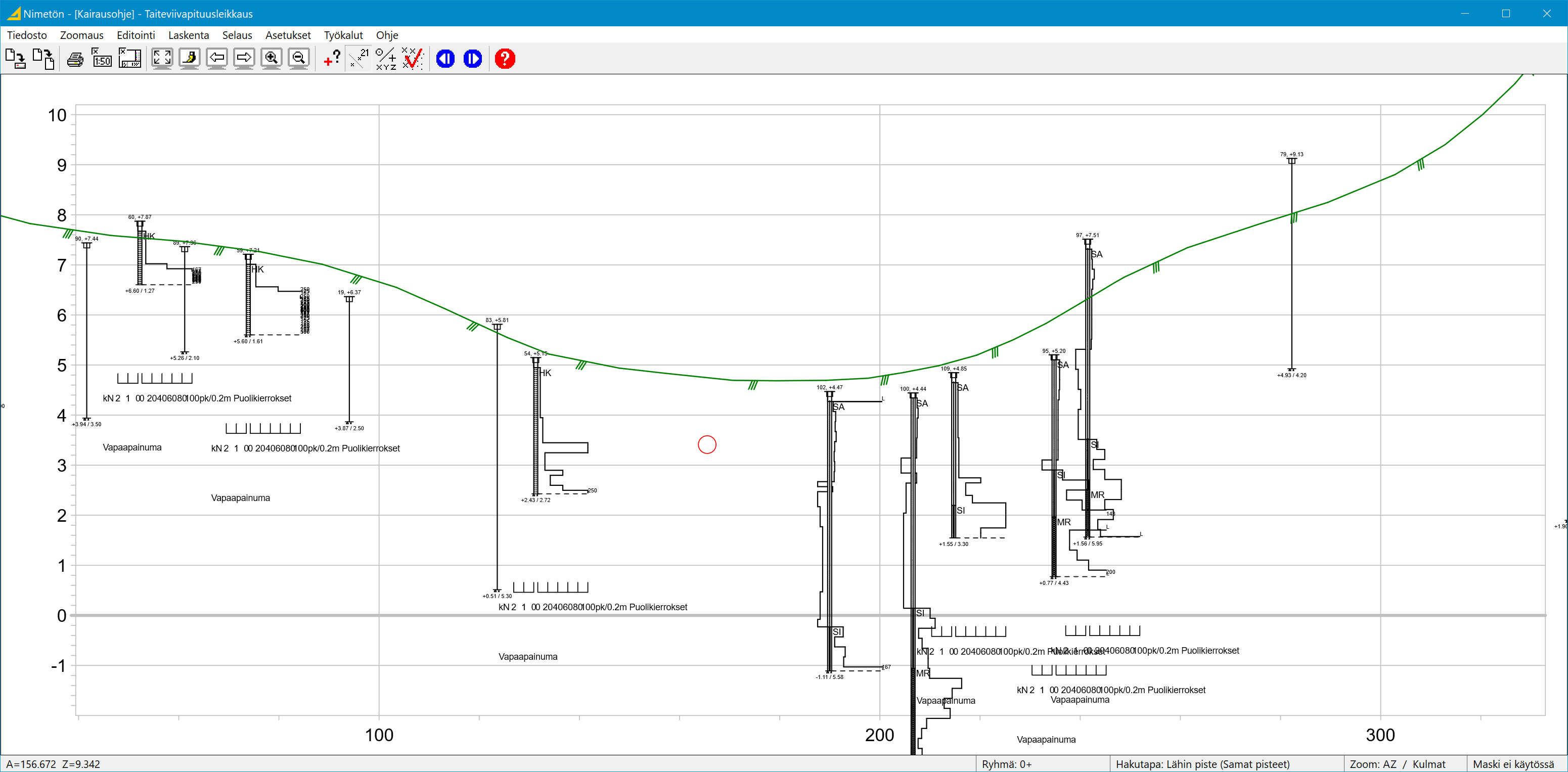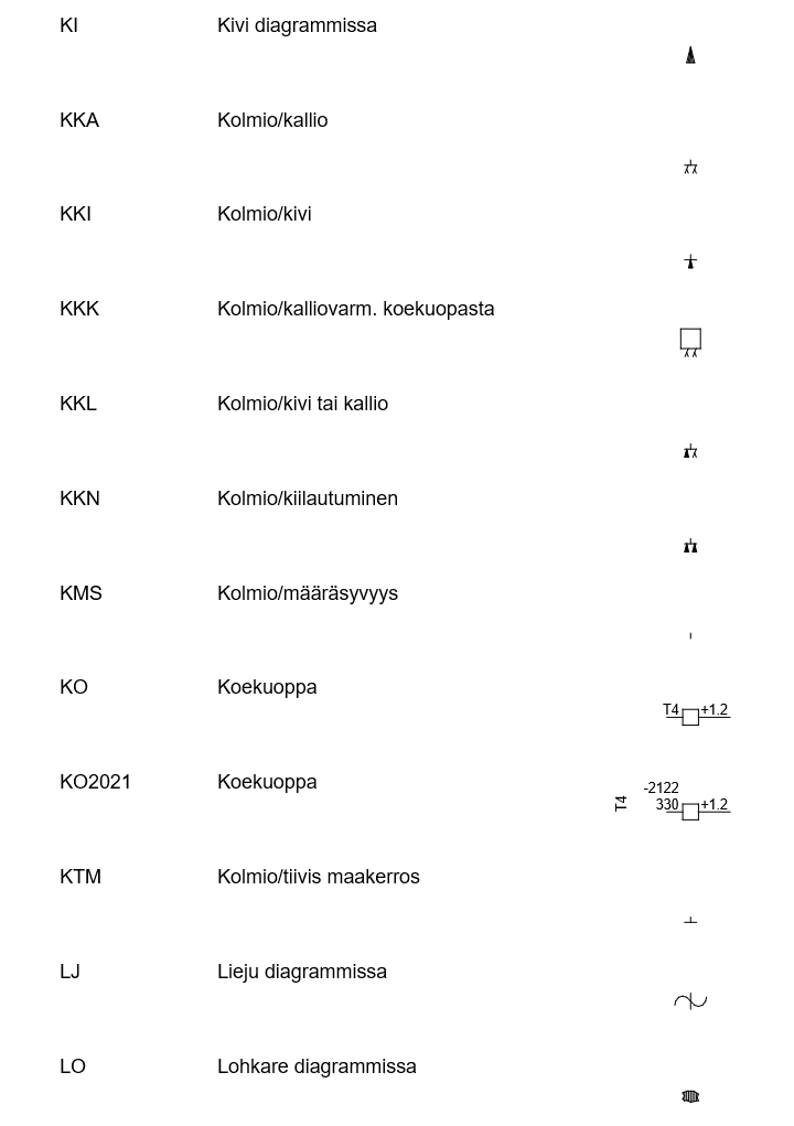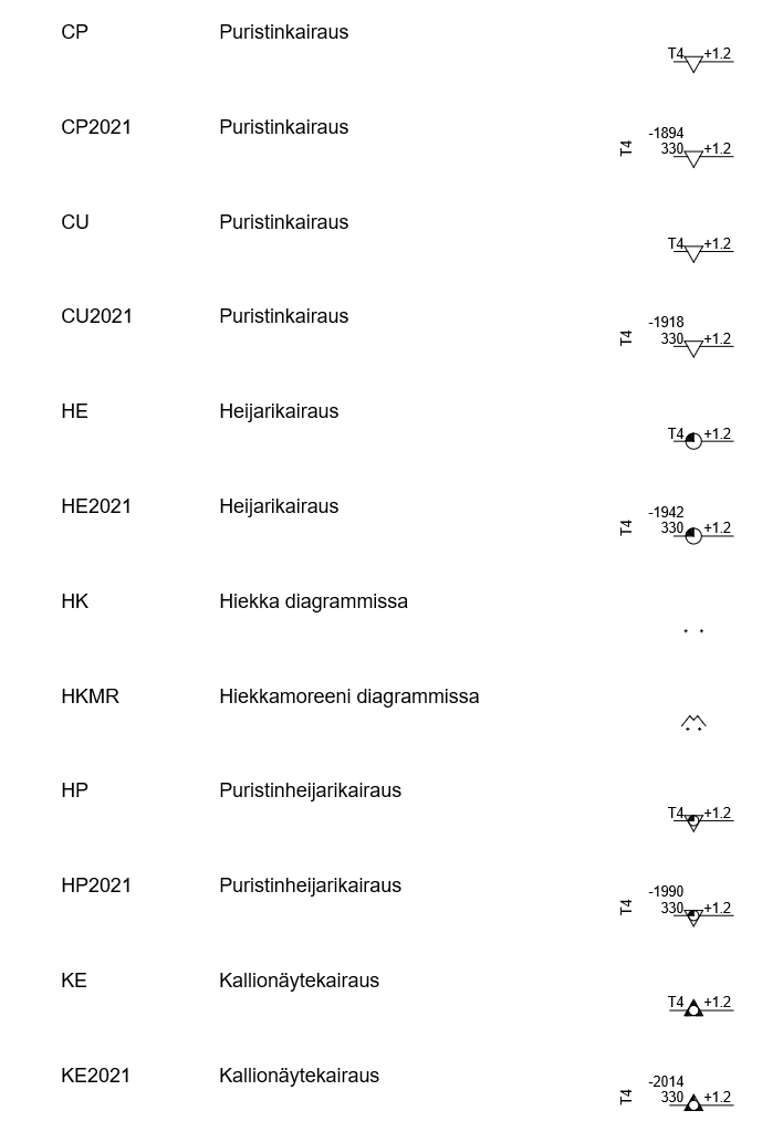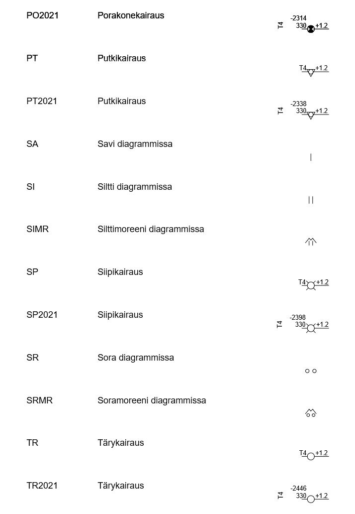 Infra -pohjatutkimusformaatin 2.5 ja SGY:n 201 mukaiset kairaussymbolit on lisätty ohjelman käyttämään systeemikoodikirjastoon valmiiksi. Tarkista että käytössäsi on systeemikirjastona system_64.dat tiedosto tai uudempi (Pääikkunan toiminnolla Asetukset – Koodit).