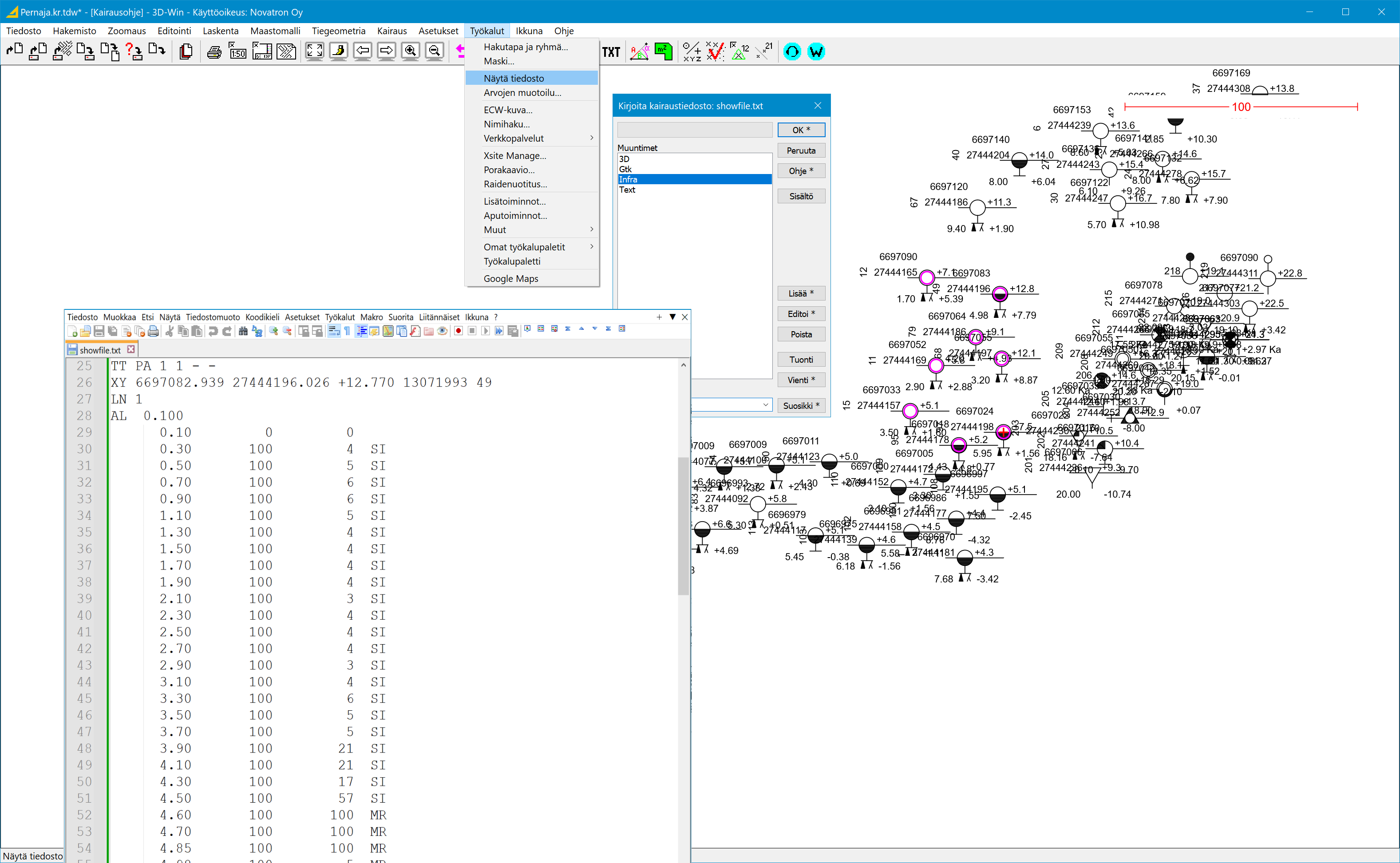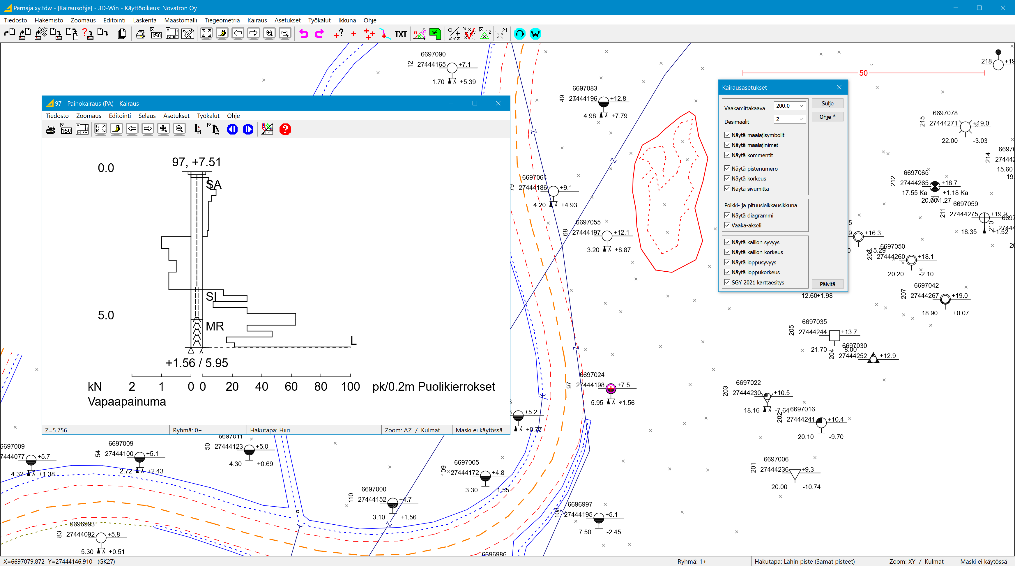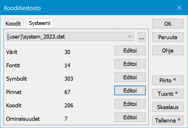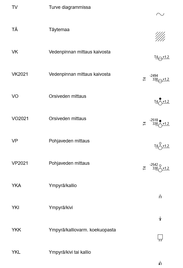 Infra -pohjatutkimusformaatin 2.5 ja SGY:n 201 mukaiset kairaussymbolit on lisätty ohjelman käyttämään systeemikoodikirjastoon valmiiksi. Tarkista että käytössäsi on systeemikirjastona system_64.dat tiedosto tai uudempi (Pääikkunan toiminnolla Asetukset – Koodit).