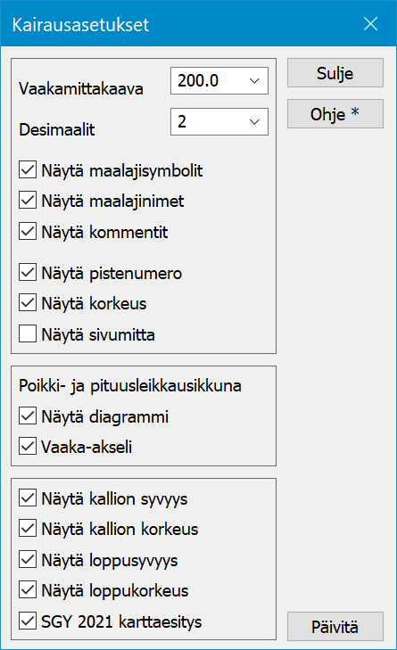 Näytä maalajisymbolit määrää, näytetäänkö maalajisymbolit diagrammeissa. Maalajisymbolit etsitään kooditiedoston symbolilistasta lyhentämällä maalajikoodia kunnes symboli löytyy. Esimerkiksi maalajille hkSiMr etsitään ensin symbolia hkSiMr, sitten SiMr ja lopuksi Mr. Kirjainkoolla ei väliä.