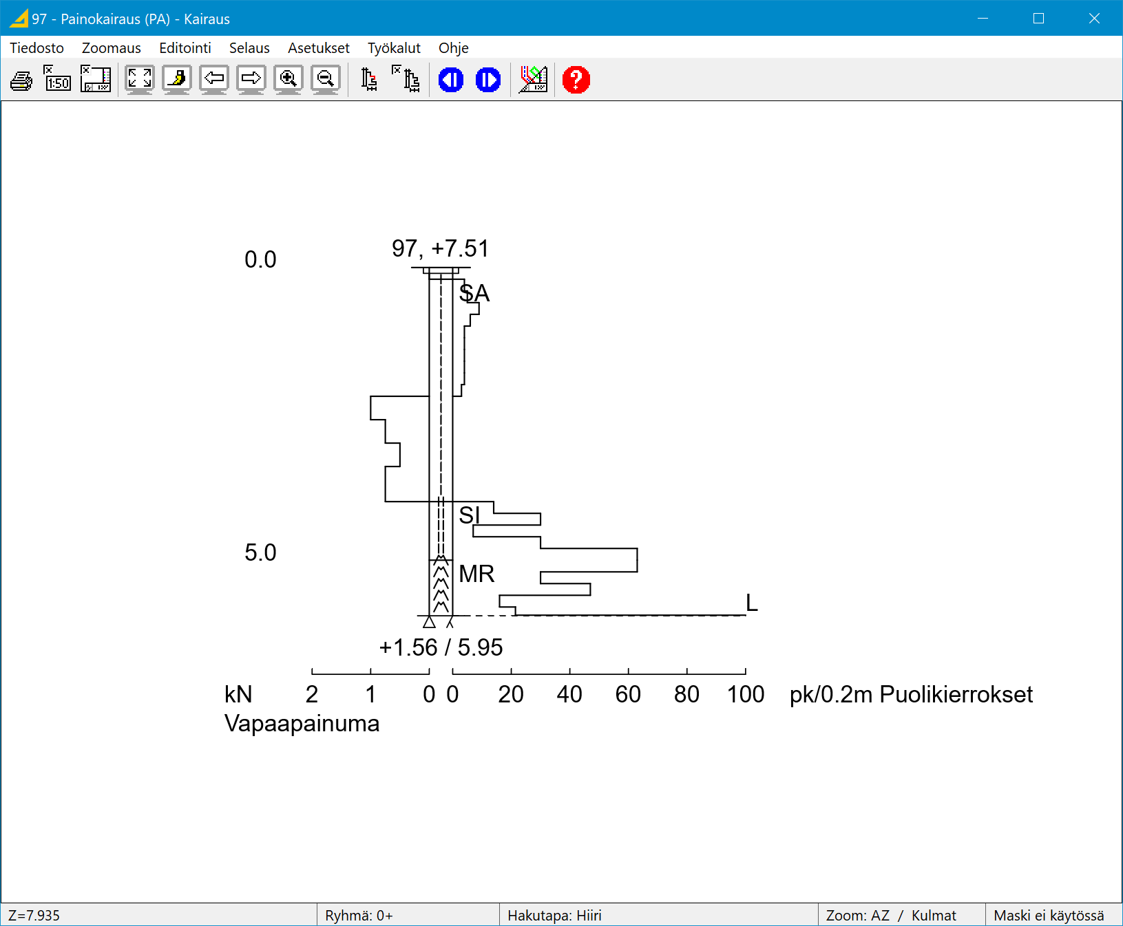 Avaa kairausikkunasta toiminto Tiedosto – Tulostus – Sarjatulostus, jolla voi tulostaa kairausdiagrammikuvia sarjana.