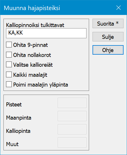 Maanpinta kertoo luodut uudet maanpinnan hajapisteiden lukumäärän. Kaikki muut kairapisteet muunnetaan hajapisteiksi, paitsi valinnan mukaan 9-pinnan pisteet ja Z=0 -pisteet. Maanpinnan pisteet saavat pintatunnuksen T1 = 1 ja korkeudeksi tulee kairapisteen Z-koordinaatti.