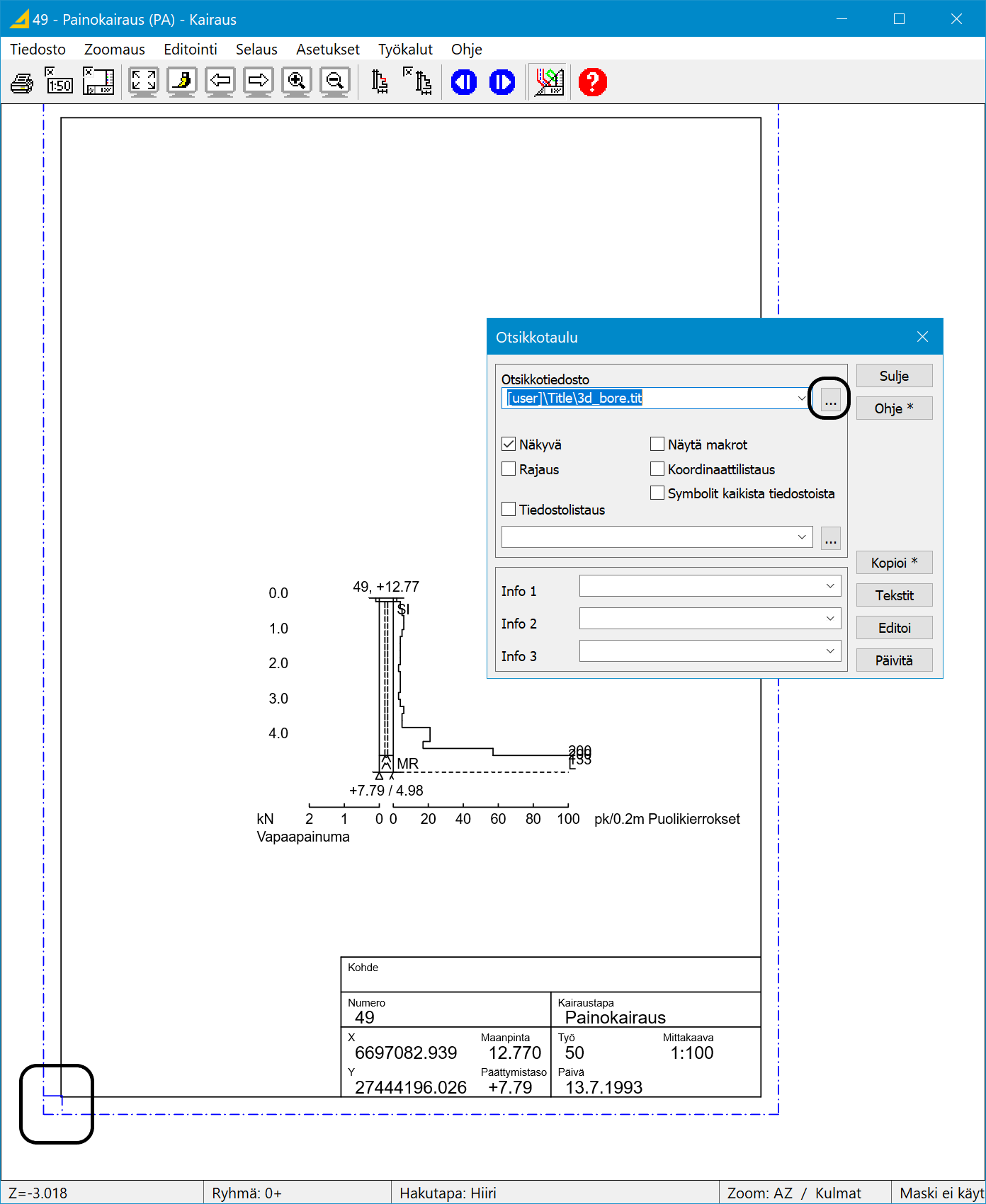 Kairausikkunaan tulee nimiö, jossa näkyy kairauksen numero, tutkimustapa, pisteen koordinaatit, mittakaava sekä päivämäärä, jos se on syötetty pisteelle. 3d_bore.tit on vain esimerkkinä, jonka avulla käyttäjä voi luoda omia otsikkotiedostoja. Ohje-painikkeella löydät lisätietoa, kuinka nimiöitä voi luoda ja muokata