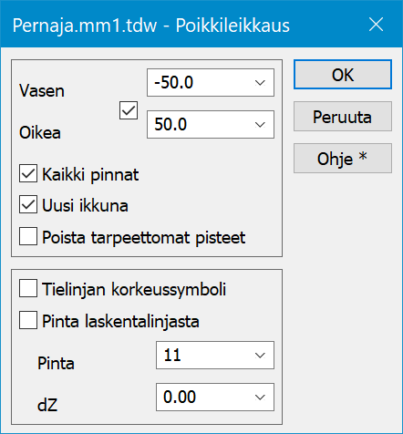 Vasen ja Oikea määrittävät kuinka kaukaa mittalinjasta poikkileikkaus lasketaan. Jos rasti on valittuna, tulee molemmille sama arvo, kun listalta valitaan etäisyys.