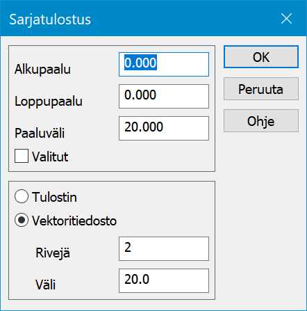 Voit tulostaa joko tulostimelle (1 diagrammi/paperi). Huom. Voit tulostaa vain oletuskirjoittimellesi tai vektoritiedostoon (=kuvatiedosto) sarjatulosteen.