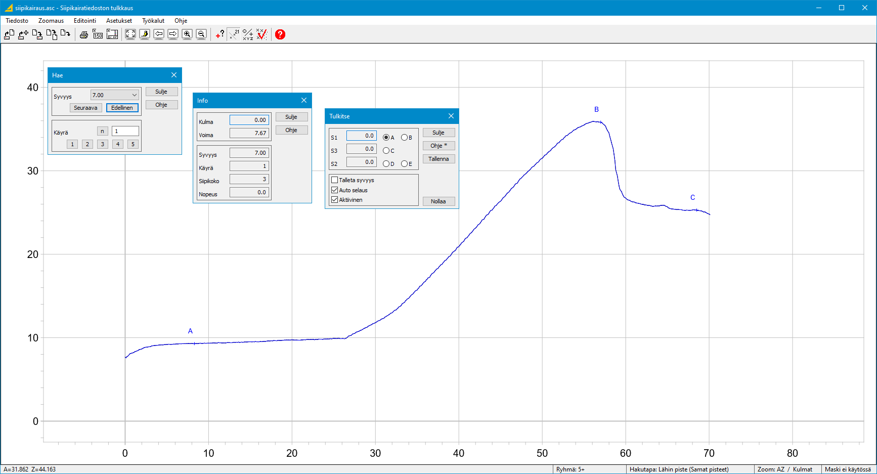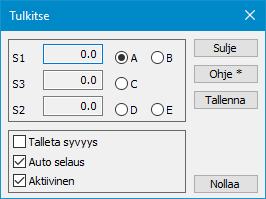 Tulkinta-toiminnolla määritetään kustakin syvyydestä 5 pistettä, joista lasketaan tunnusluvut S1, S2 ja S3.