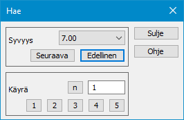 Hae-toiminnolla voit kelata syvyyksiä ja käyriä edestakaisin. Syvyyslistaan tulevat vain luetuissa tiedostoissa esiintyneet syvyydet. Käyrät 1-5 voidaan valita omilla napeillaan ja muut antamalla kenttään arvo ja painamalla n-näppäintä