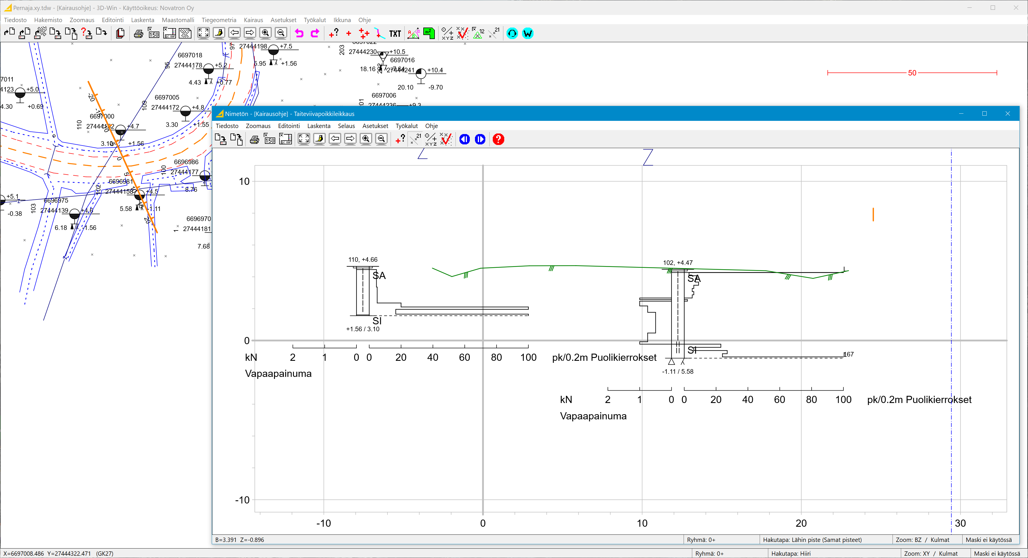 Uusi ikkuna avaa lasketut poikkileikkaukset suoraan uuteen poikkileikkausikkunaan.