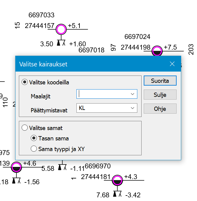 Valitse samat valitsee ne kairapisteet tai pisteet, joilla on samat XY-koordinaatit ja sama tyyppi. Samoista pisteistä ensimmäinen jätetään valitsematta, muut ehdot täyttävät lisätään Ryhmään.