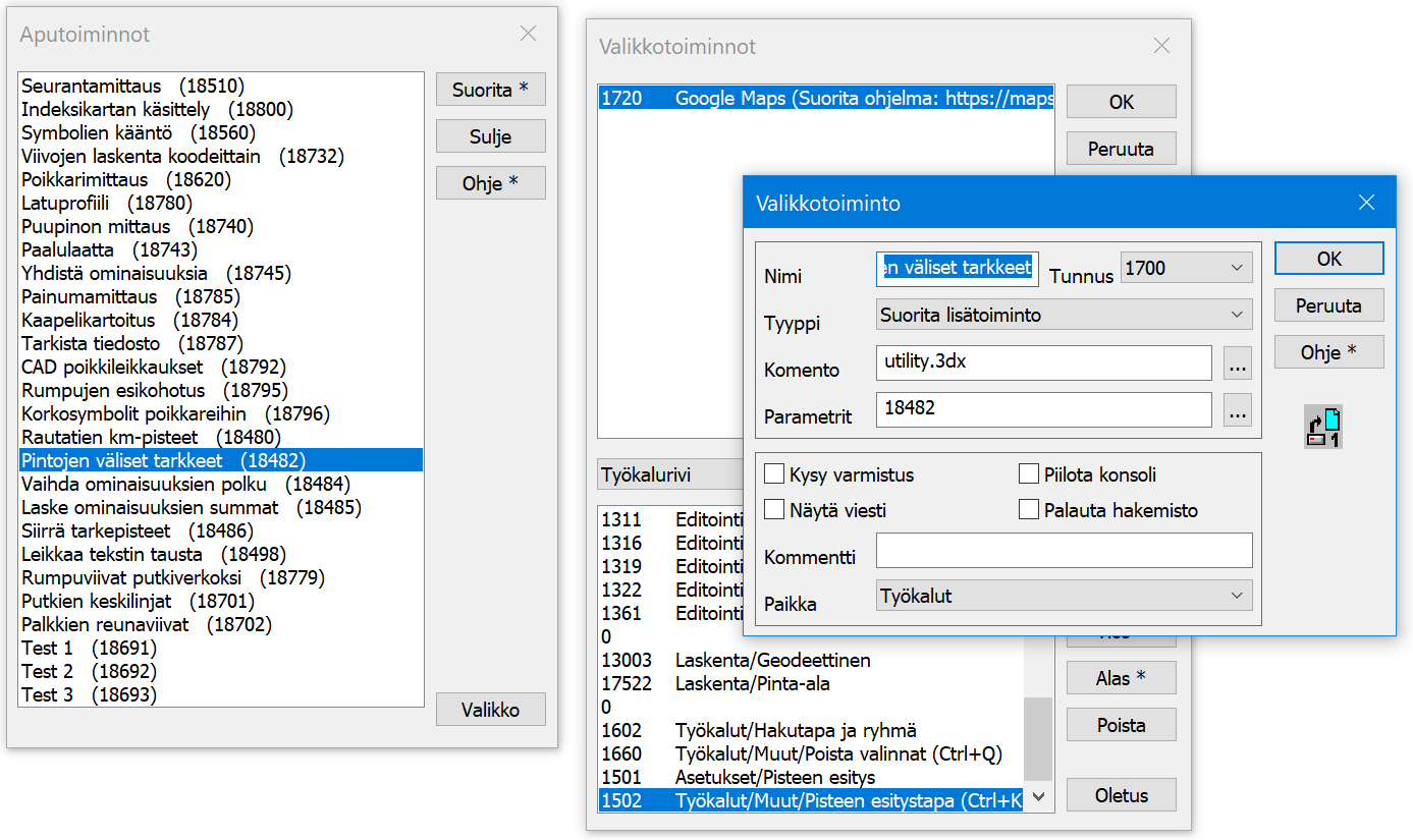 Valikkotoimintojen avulla voi lisätä valikoihin usein toistuvia toimintoja (lue formaatilla, talleta formaatilla, suorita ohjelman sisäinen toiminto parametrein tai lisä/aputoiminto tai suorita koordinaatistomuunnos). Voit lisäksi käynnistää ohjelmasta ulkopuolisen ohjelman ja siirtää sinne esim. pisteen koordinaatit tai vaikka liitetiedoston (jpg-kuvan) käsiteltäväksi.