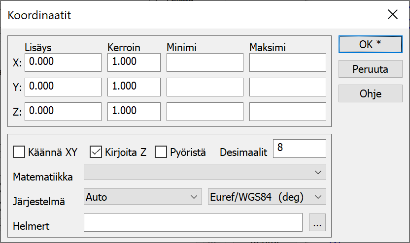 Alkuperäisen koordinaatiston automaattitunnistus vaihtoehdolla "Auto" toimii Suomessa yleisesti käytettyjen koordinaatistojen kanssa. Desimaalien määräksi kannattaa laittaa tarpeeksi iso arvo, jotta riittävä tarkkuus säilyy. Käännä XY -asetus tarvitaan GDAL/OGR ja Text -muuntimien kanssa. GPX-muunnin ei sitä tarvitse, vaan kirjoittaa X-koordinaatin oletuksena leveyspiiriksi.