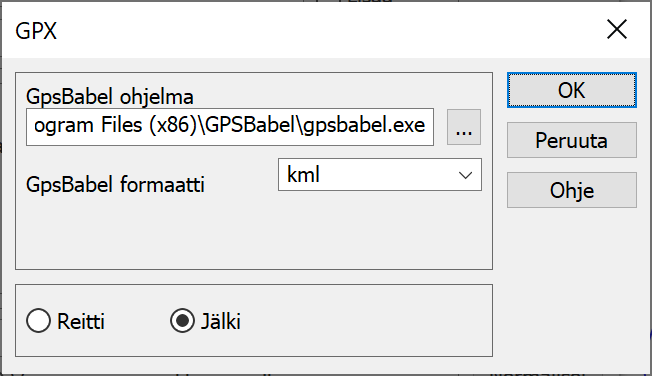 GPX-muuntimen muunninkohtaisin asetuksiin laitetaan GPSBabel ohjelman sijainti ja valitaan formaatiksi KML. Alareunan asetuksista valutaan haluttu viivamuoto ja muuntimen yleisiin asetuksiin käydään muuttamassa tiedostopäätteeksi *.kml.