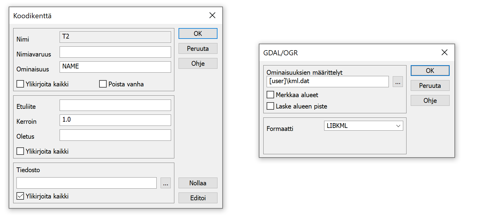Yllä oleva ohjaintiedosto kml.dat kirjoittaa GDAL/OGR muuntimeen erityisen ominaisuuden NAME, jonka se tunnistaa kohteen nimeksi. Tämä nimi kirjoittuu sitten kunkin formaatin ymmärtämäksi nimeksi. Tässä tapauksessa voimme käyttää nimenä viivan numeroa kentässä T2. Ensin muuntimen kenttäasetuksissa siirretään T2 ominaisuudeksi NAME ja sitten edellä määritetty ohjaintiedosto lisätään muunninkohtaisiin asetuksiin:
